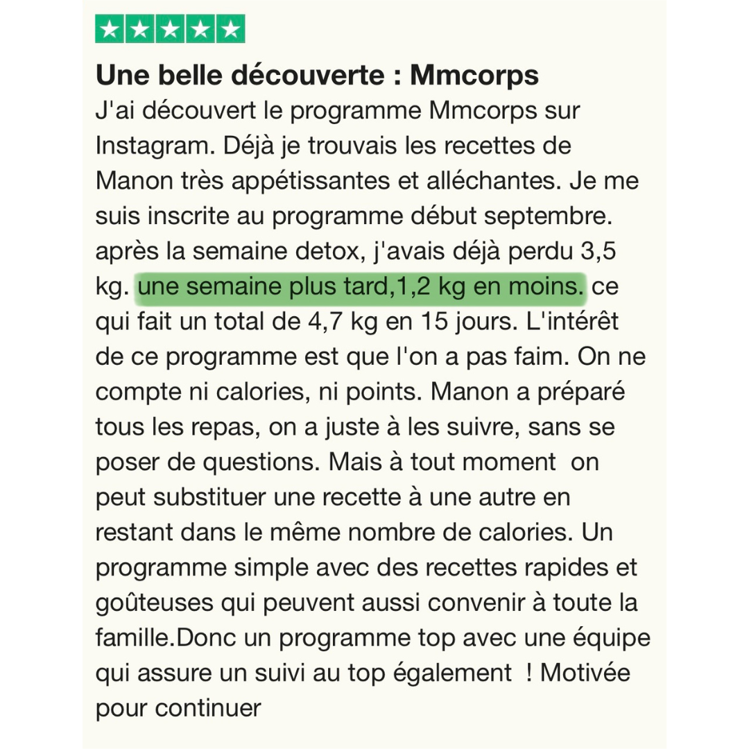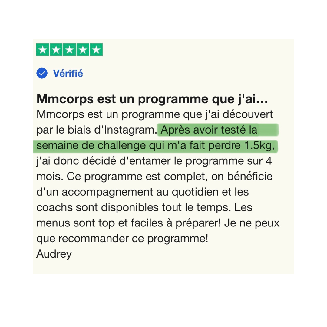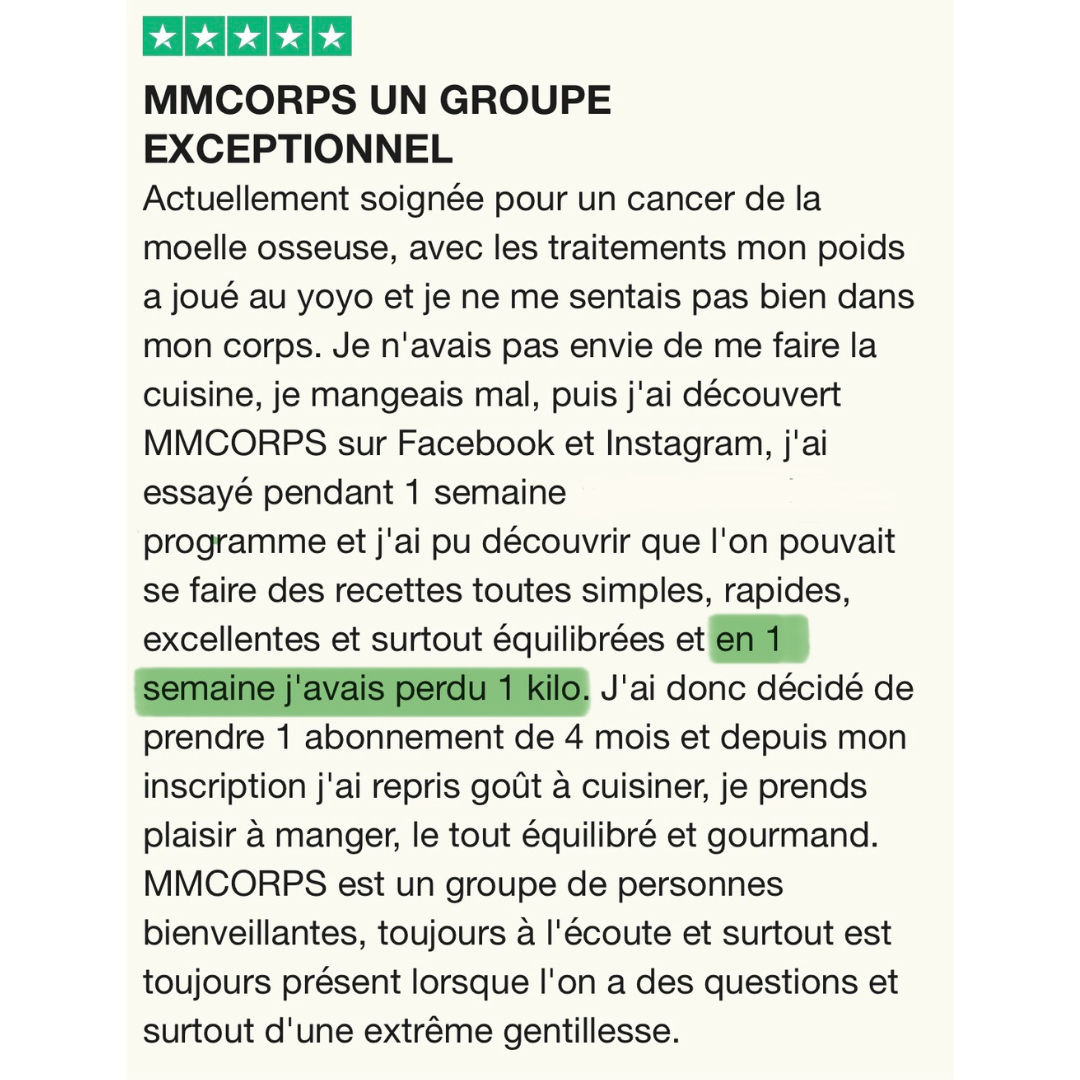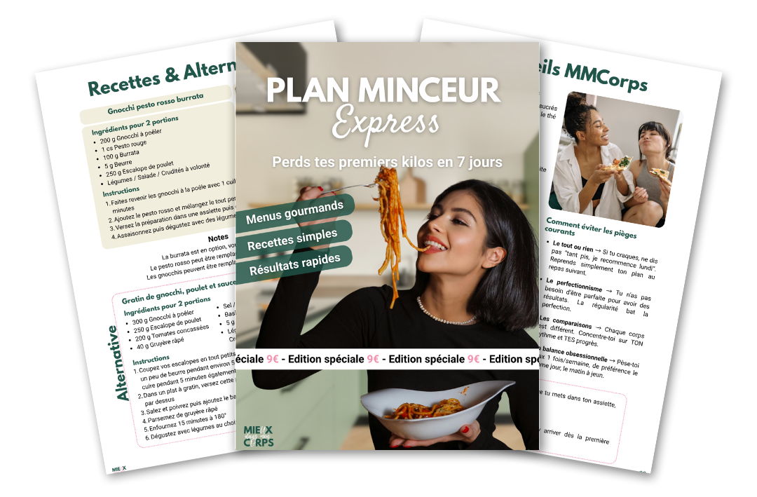 Dans ce plan express à 9 €, tu as menus + recettes + conseils. Pour un suivi personnalisé avec coaching et communauté, tu peux ensuite rejoindre MMCorps.
