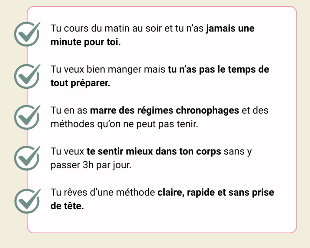 Tu es juste épuisée de devoir tout gérer : le travail, la maison, les repas, les enfants… et ta santé passe toujours en dernier.